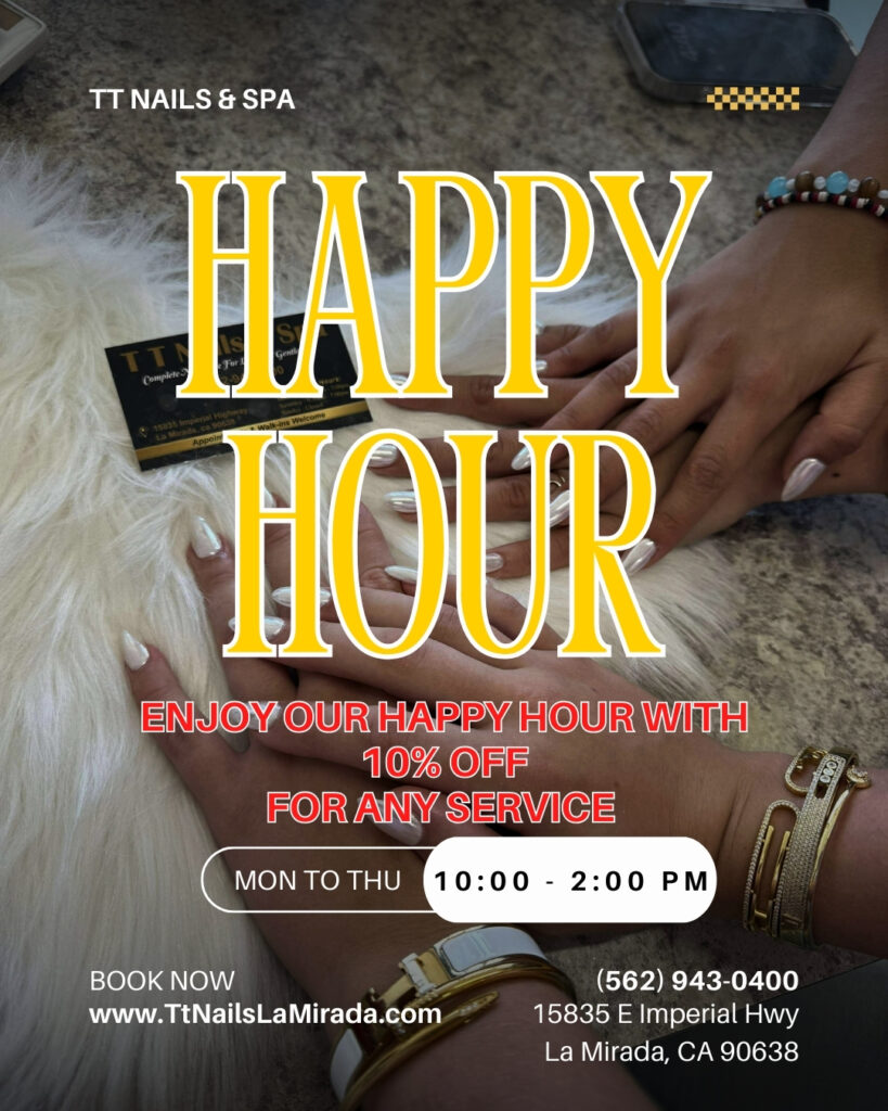 Welcome to TT Nails & Spa ! One of the best Nail Salons in 15835 E Imperial Hwy, La Mirada, CA 90638 where we provide you with an unforgettable beauty and wellness experience. Our Nail salon offers an array of luxurious services and treatments, from signature spa pedicures and manicures to stunning nail designs, all using only the best brand name products. We are passionate about your safety and comfort, and pledge to uphold the highest industry standards. Our modern-inspired salon is designed to create a calming and inviting atmosphere for you to enjoy your treatments in. We are committed to providing you with the best services and treatments that will leave you feeling refreshed and invigorated. Book an appointment today and let us help you on your path to better health and well-being.